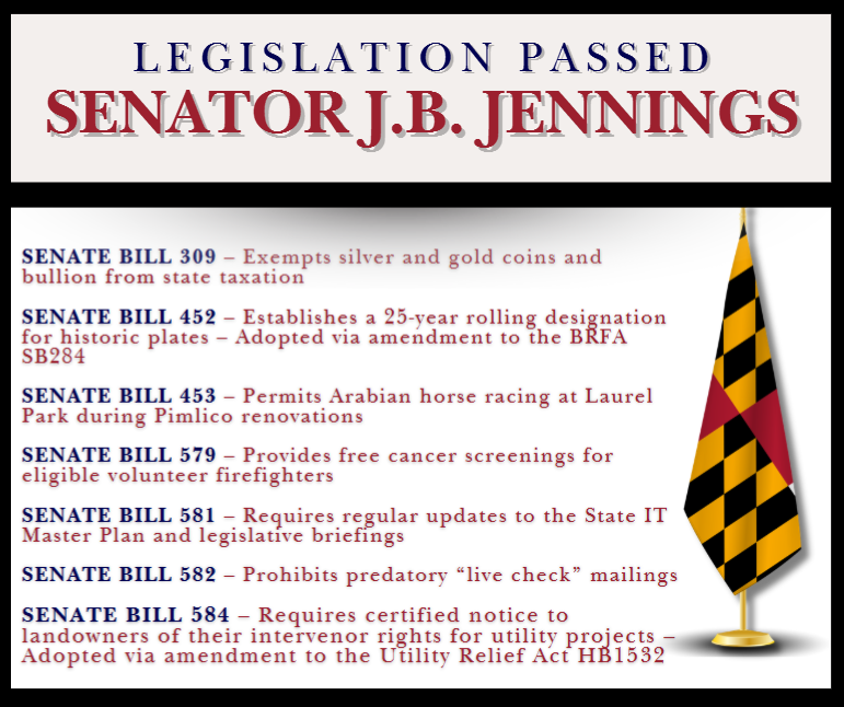 - Senate Bill 310 (Protects Juveniles), Senate Bill 104 (Reinforces Fair Districts), Senate Bill 309 (Removes a Tax), Senate Bill 382 (Retire in Maryland)