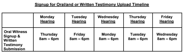 To testify in favor or against a bill, you must sign up 48 business hours prior to the hearing of the bill 8am–6pm EST. For example, a Wednesday bill hearing would require a Monday 8am-6pm sign up time.